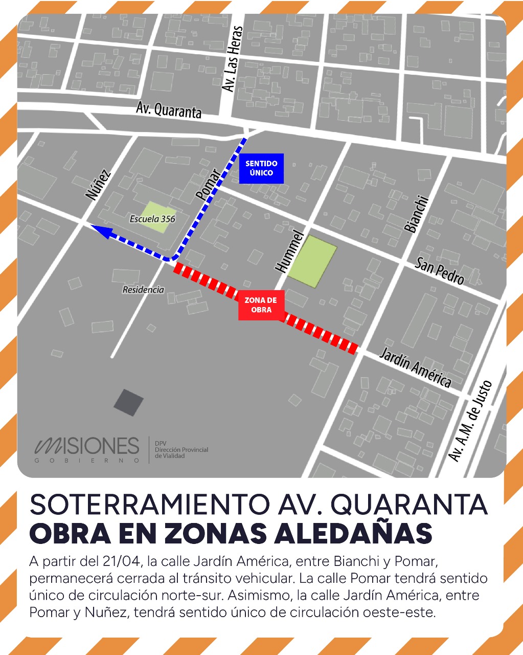 Por ello, desde el lunes 21 de abril de 2025 se interrumpirá por unos 60 días la circulación vehicular en un sentido de la calle Pomar, que podrá recorrerse solamente de Norte a Sur. La calle Jardín América quedará totalmente cortada entre las arterias Pomar y Bianchi, quedando habilitada solo en sentido Este – Oeste entre Pomar y Nuñez.