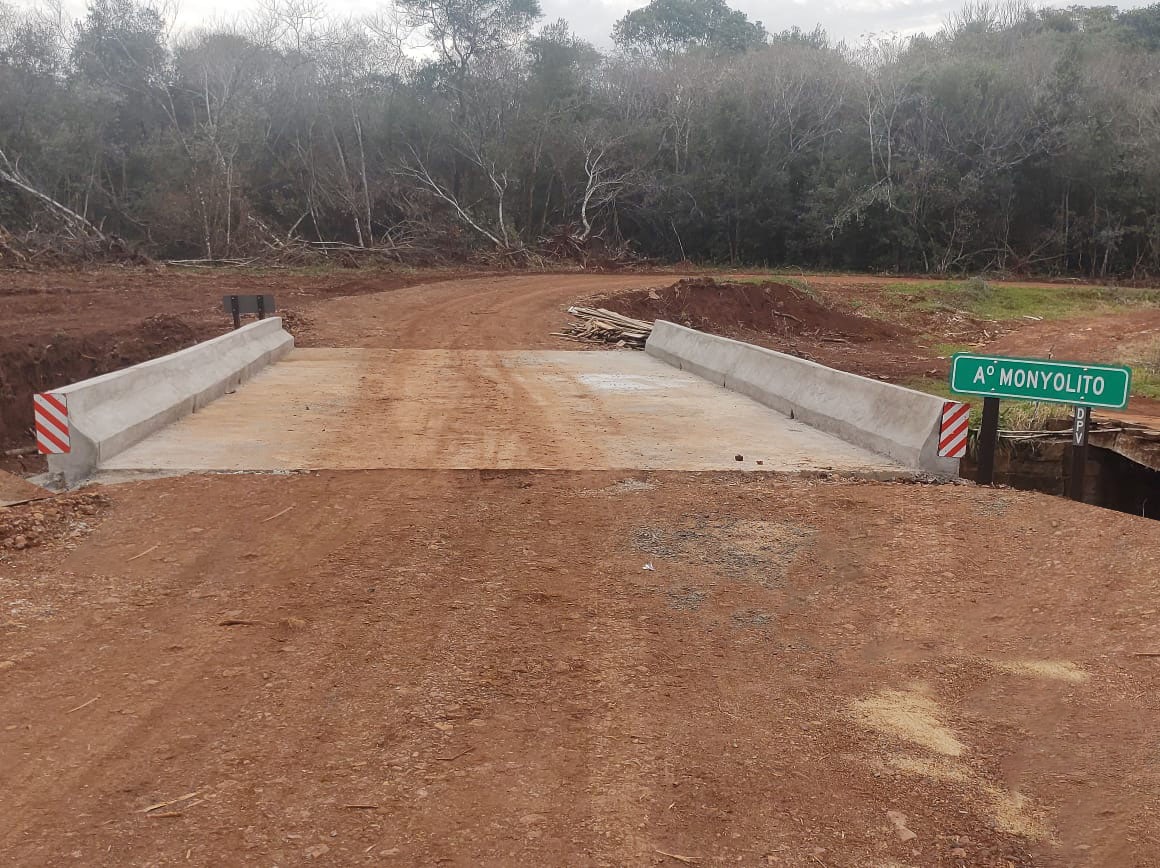 También en el Municipio de San Antonio, la DPV terminó la construcción de un nuevo puente en el pasado mes de julio de 2022, el cual quedó completamente habilitado al tránsito. Se trata de un nuevo paso sobre el Arroyo Monyolito en el paraje homónimo. El mismo reemplazó a una vieja estructura de base de piedra y tablero de madera, que tenía un solo carril de circulación y ya resultaba obsoleta para la demanda del tránsito actual.