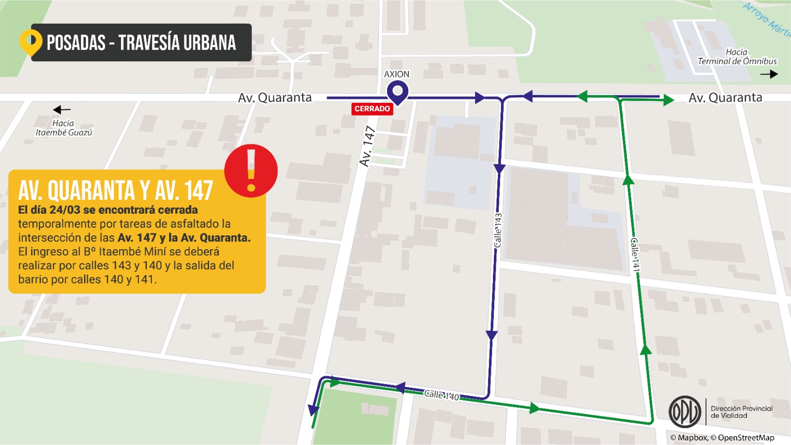 La Dirección Provincial de Vialidad informó que, en el marco de la obra de Travesía Urbana de Posadas, este viernes 24 de marzo estará cerrada la avenida 147 - Acceso a Itaembé Miní- tanto para ingreso como salida de vehículos hacia avenida Quaranta.