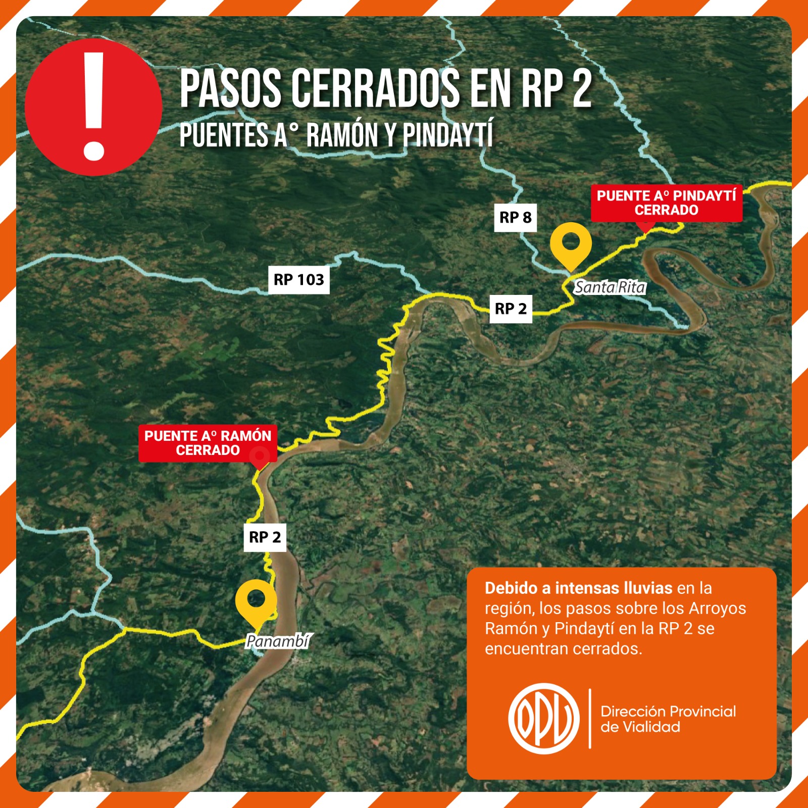 En el caso del Puente Pindaytí, se colocó señalización sobre Ruta Provincial Nº 2 desde 8 kilómetros antes y con cartelería se indican los diferentes desvíos con información exacta a los conductores. Las rutas alternativas son la RP 8, RP 9 y RP 13. Vialidad de Misiones está construyendo el puente definitivo y el mismo tiene un importante avance de obra, con el tablero ya hormigonado y los terraplenes en proceso de ejecución. La obra es financiada por el Gobierno Nacional tras gestiones del Gobierno de Misiones.