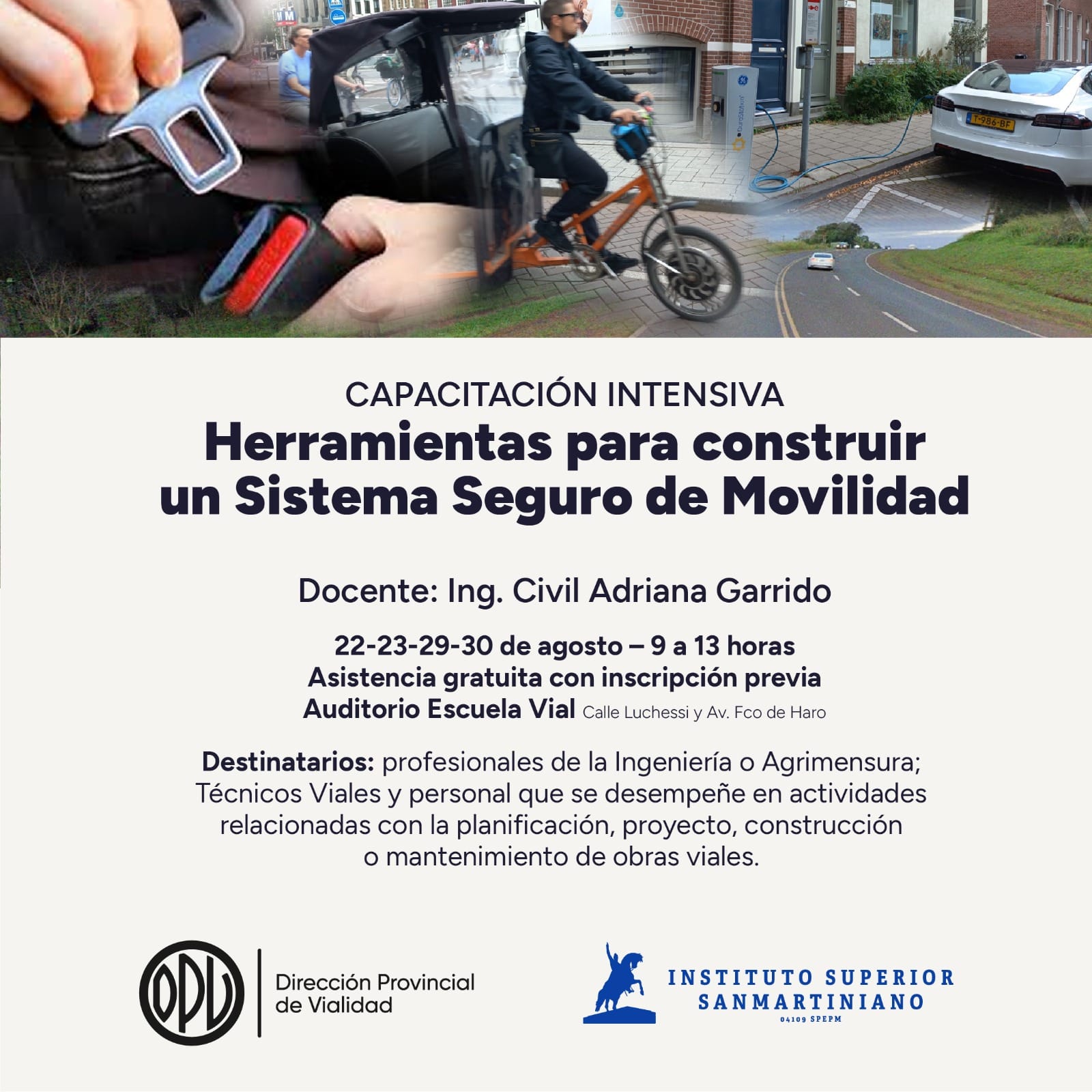Con el propósito de contribuir a la formación y capacitación en materia de seguridad vial, la Dirección Provincial de Vialidad (DPV) y El Instituto Superior Sanmartiniano, convocan a una capacitación intensiva destinada a profesionales de la ingeniería y agrimensura y técnicos involucrados en el proyecto, construcción y mantenimiento de obras viales, equipos de Vialidad Provincial y Nacional.