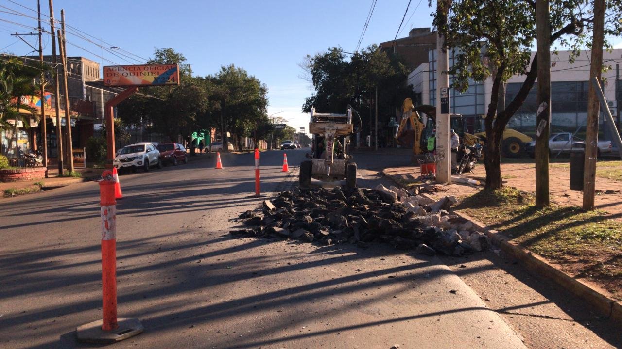 Los equipos viales realizan la demolición del pavimento flexible dañado, retiro de material, conformación de nueva base y carpeta de rodamiento de hormigón.